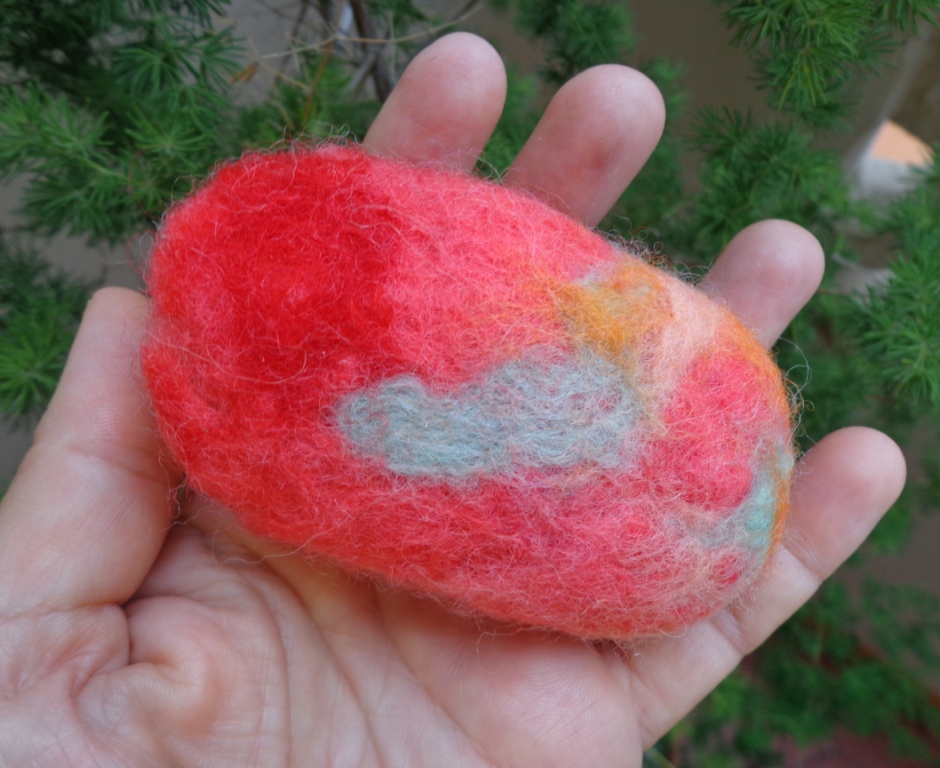 A feltragem molhada manual é uma técnica em que pressionamos a lã umedecida até conseguirmos o efeito de um tecido compacto, o feltro. É uma combinação de temperatura, trabalho manual e da própria lanolina presente no material.