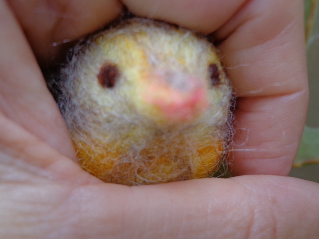 Nascendo mais um Piu, para servir de exemplo aos participantes da oficina do dia 22. Comecei com uma bola, como o exemplo anterior, agora feita com a lã mais solta e menos definição nos desenhos. A lã de carneiro é uma matéria-prima muito sutil, quanto mais leve a feltragem, mais bonita a peça. Quanto menos desenhamos o bicho, mais natural ele fica.