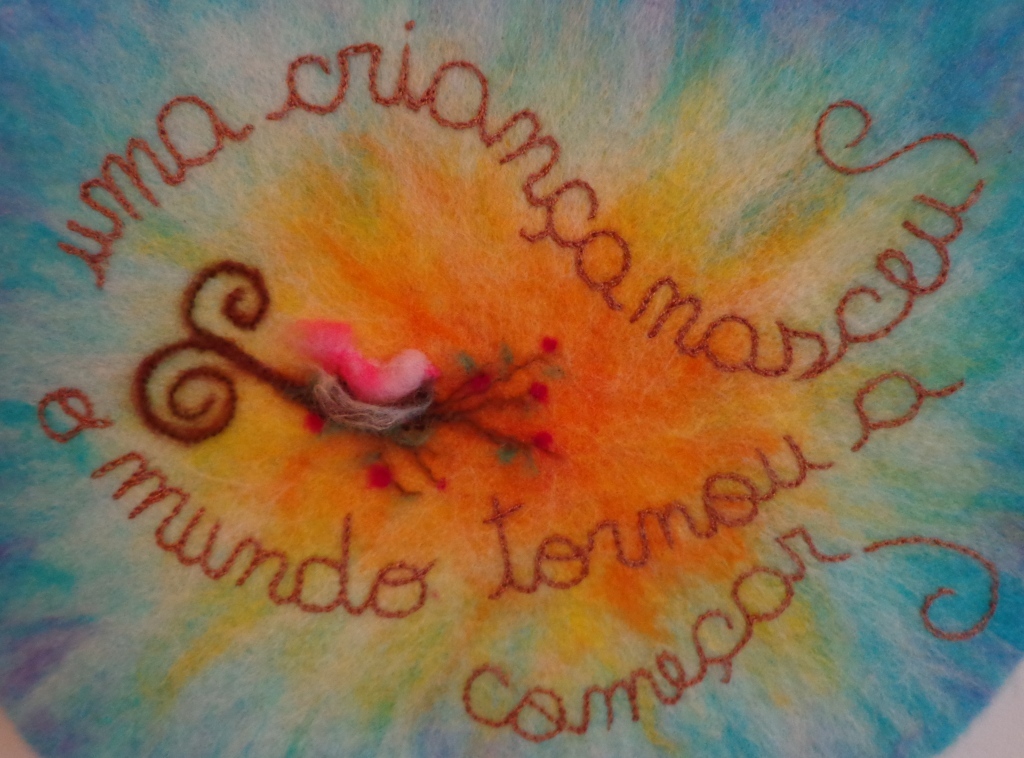 Com calma, foi imaginando o painel, com os elementos que selecionou, eu anotando os detalhes, acolhendo, construindo a imagem mental. As cores do escudo de Micael para o fundo. A cor do bordado: marrom, violeta? E passarinhos, dois, o bebê no ninho e a irmãzinha, no galho florido. A frase ela já havia escolhido: uma fala de Riobaldo, em Grandes Sertões Veredas, revisitada.