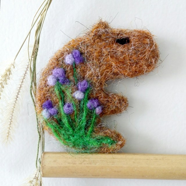 Hoje fiz um cachorro articulado. Muitos cortes de lã foram necessários, gerando restinhos de lã. No final do dia, com estas sobrinhas, fiz uma capivara sobre feltro, que é uma técnica de rápida execução.