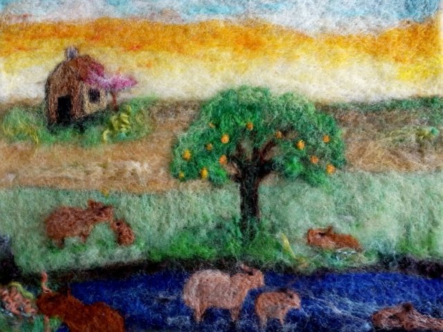 Recortei uma Capivara. O corte com tesoura de uma peça feltrada, cria extremidades dificeis de serem compactadas com agulha. Fiz agulhamento, coloquei orelhas e olhos mas o entorno continuou solto (veja a primeira foto).